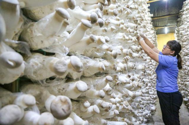 10月8日,在福建省漳州市南靖县丰田镇奇蕈食品项目恒温出菇房内,营养袋中的杏鲍菇长势良好,整齐有序地排列在墙面上,工人们正在进行成熟杏鲍菇地采摘和分拣。